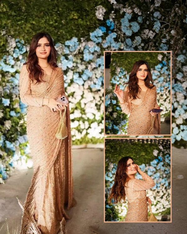 Aroob Jatoi & Iqra Kanwal Wearing Mirosh Luxury Chiffon Saree - Beige